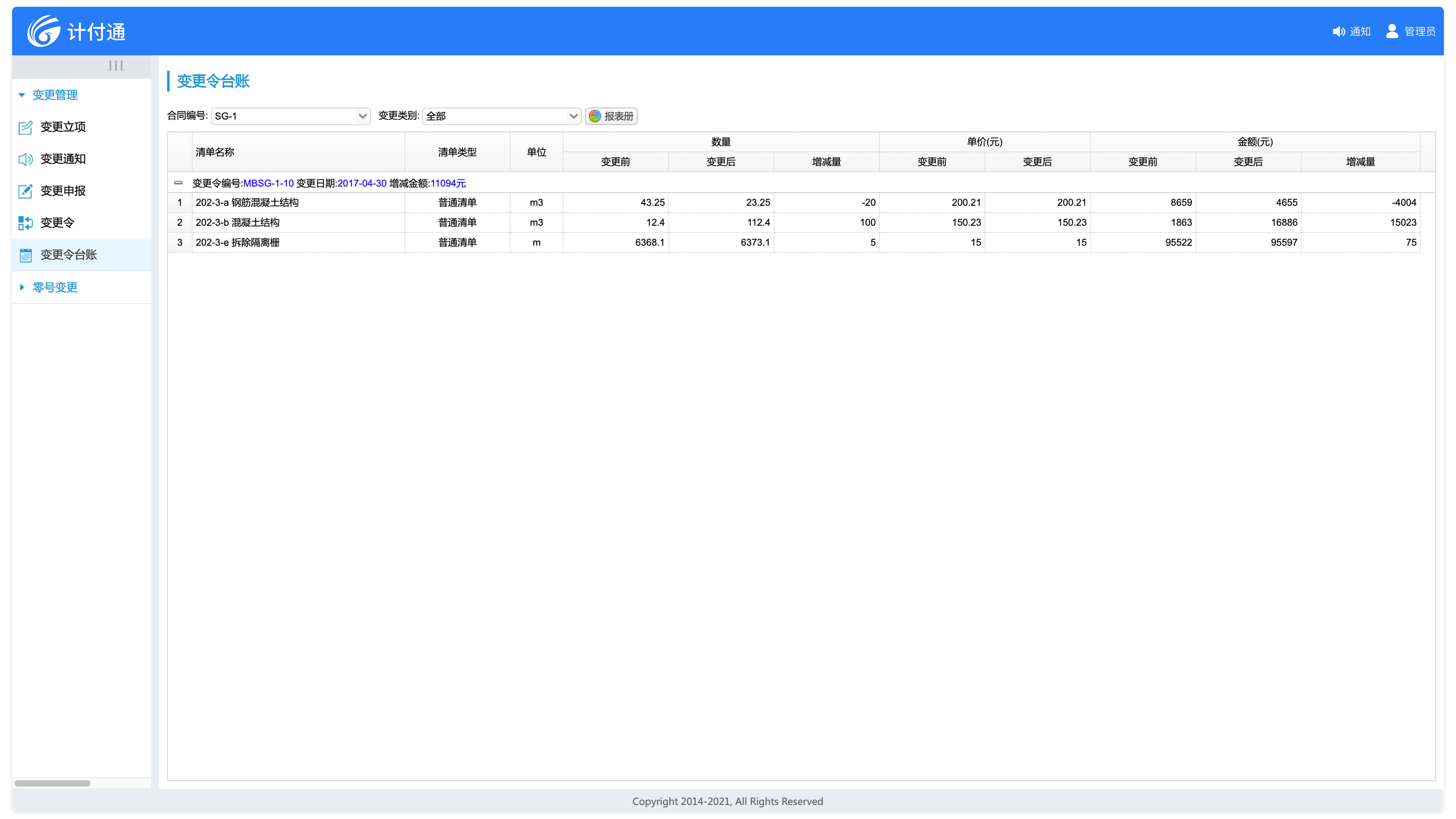 變更令生效后,變更數(shù)據(jù)實(shí)時(shí)同步至合同清單,作為變更計(jì)量的依據(jù)。